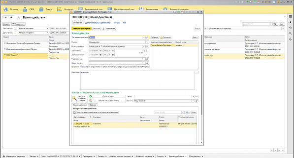 Клиент-менеджер сохраняет в системе реквизиты клиентов, договора и соглашения, телефоны и адреса контактных лиц. Планирует события и напоминания о них. Сохраняется история заказов и результаты коммуникаций – переписки, звонков. Возможно подключение почтового агента. По истории взаимоотношений формируются отчеты для руководителя.